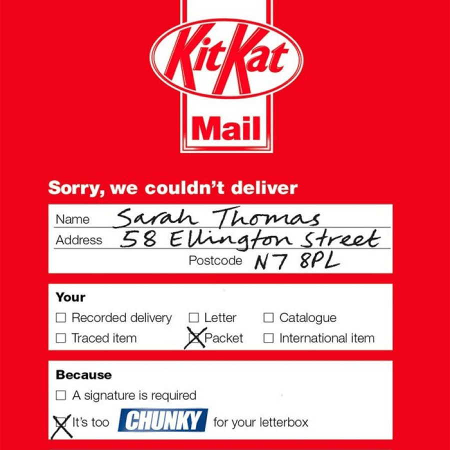 Example 1. Here’s one example of a hilarious direct mail ad. Interesting and eye-catching, KitKat’s Chunky ad makes mail fun again with its spoof on a missed delivery form. This ad works thanks to its personalization, script typography, and humorous approach.