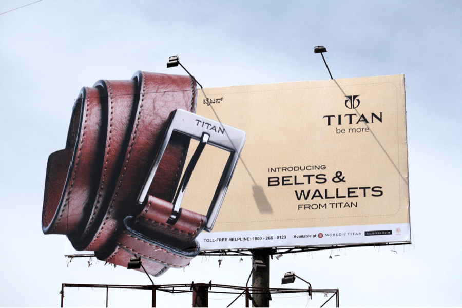 Example 1. Titan’s billboard is a creative and unique way to advertise its product. The ad makes great use of the large space with a dynamic leather belt design that stands out.