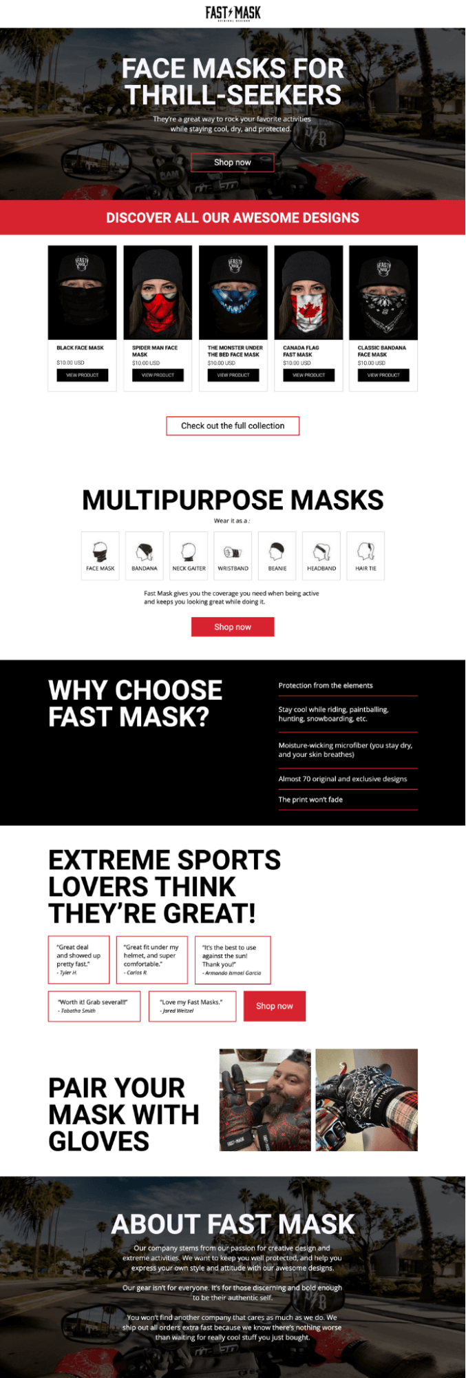 Bright red is a no-no for most websites, but Fast Mask is all about the thrill, the extreme, and being seen. We like how this copy is personable and pairs a strong color scheme with clear CTAs and content.