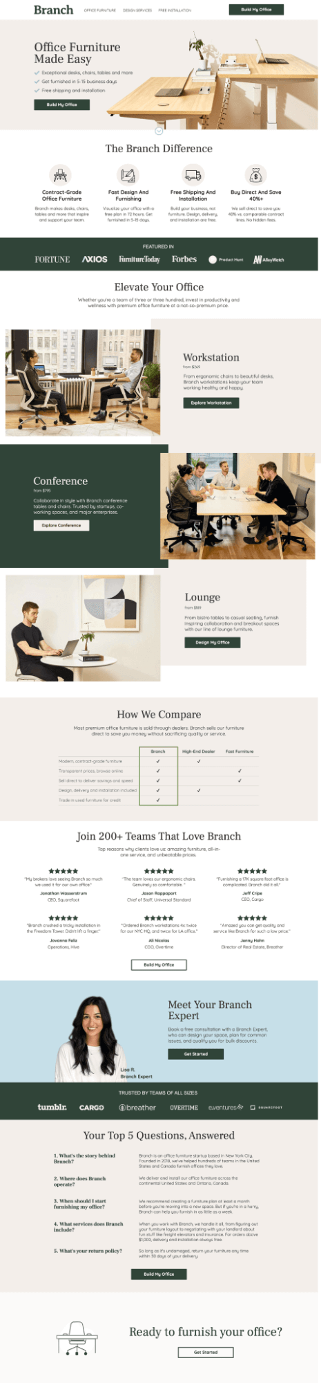 We love the above-the-fold content that immediately outlines Branch’s value proposition. They also do a great job with their unique “Build My Office” CTA button. It’s actionable, easy to find, and much different than the usual “shop now” offerings.