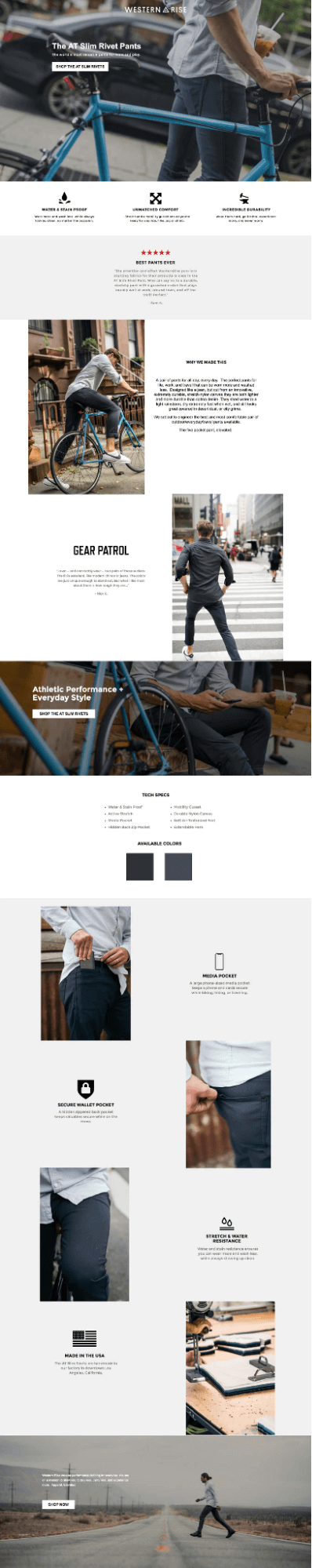 The great hero image on this landing page reflects its bold headline. Western Rise goes for a mix of short blurbs of copy coupled with several high-quality images of their product. The result is a simple and well-structured page.