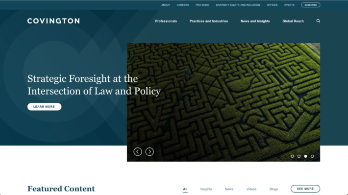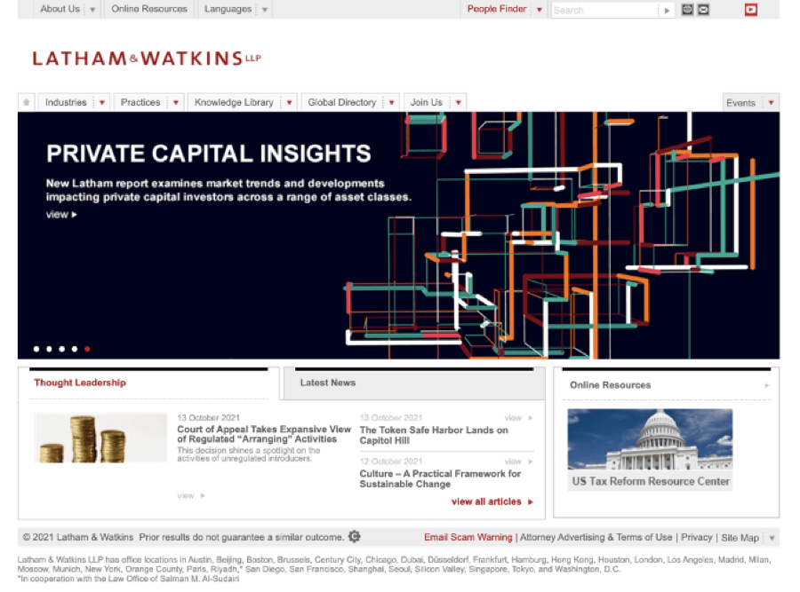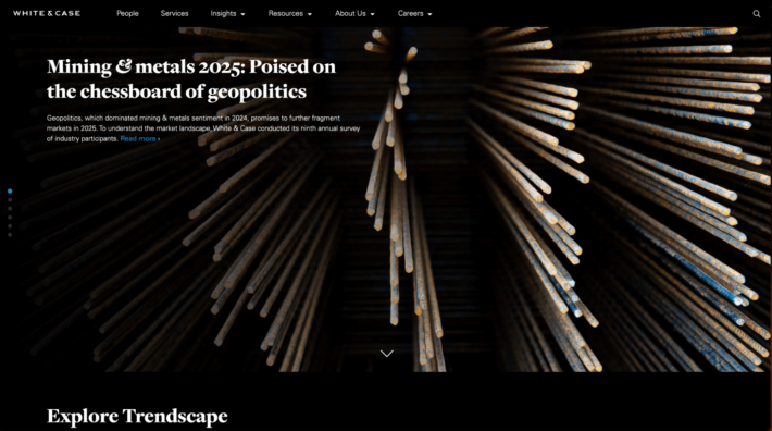 This law firm website example uses stunning background images combined with modern typography and contrasting colors to create an eye-catching and memorable design. Intuitive navigation and clear calls to action make it easy for users to browse the content and contact lawyers on this site. - White & Case