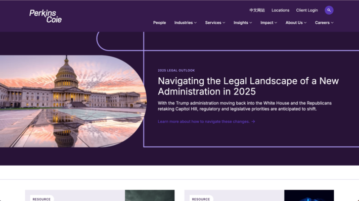 By using a solid value proposition as its main headline, Covington’s website instantly tells the visitor what they can expect to gain from working with this law firm. Combined with a clear CTA, this makes the site very easy to navigate for people who are ready to take action. - Perkins Coie