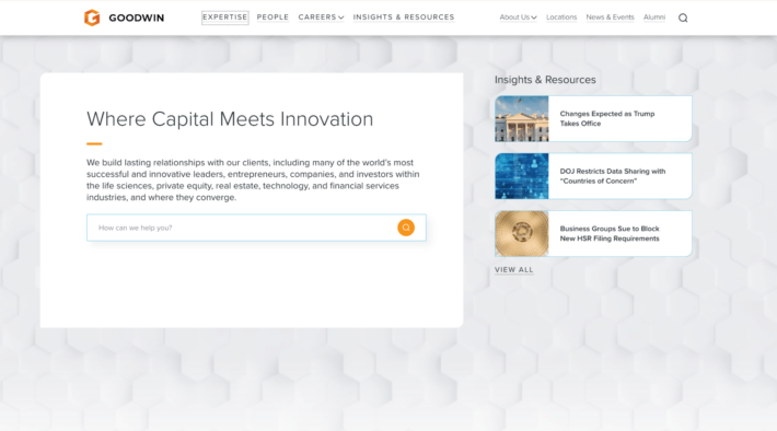 Davis Polk uses no images at all on their site, relying on the typography and color contrast to make a visual impact. This unique approach is sure to get your attention from the moment you arrive on this site. It makes this law firm’s website more memorable than its competitors with more standard design solutions. - Goodwin