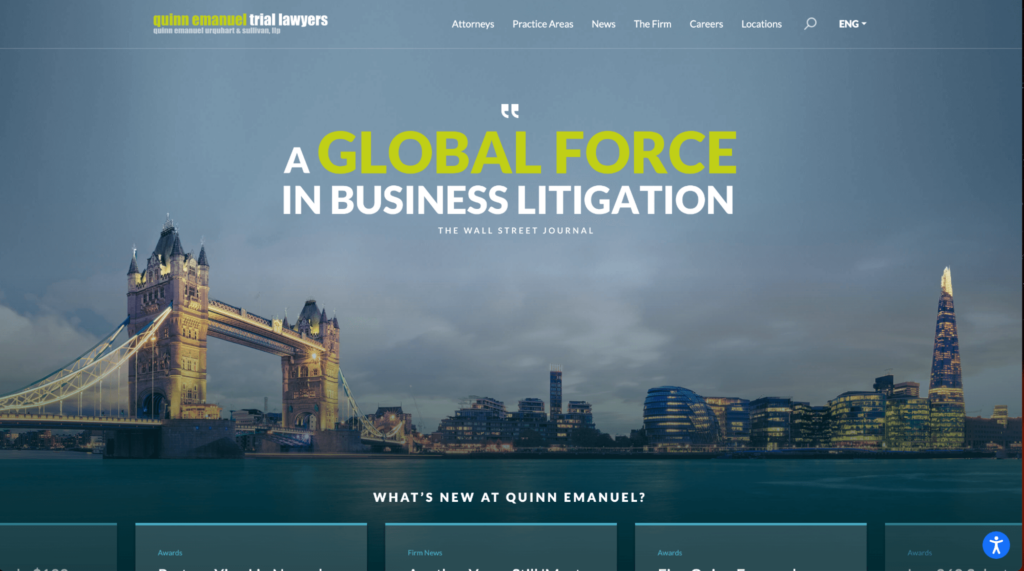 The designer of this site made a wise decision to avoid clichéd scenes and instead chose a strong, eye-catching background image with an abstract filter effect. This immediately grabs the attention of a casual browser and helps set the tone of this site as high-end and professional. - Quinn Emanuel