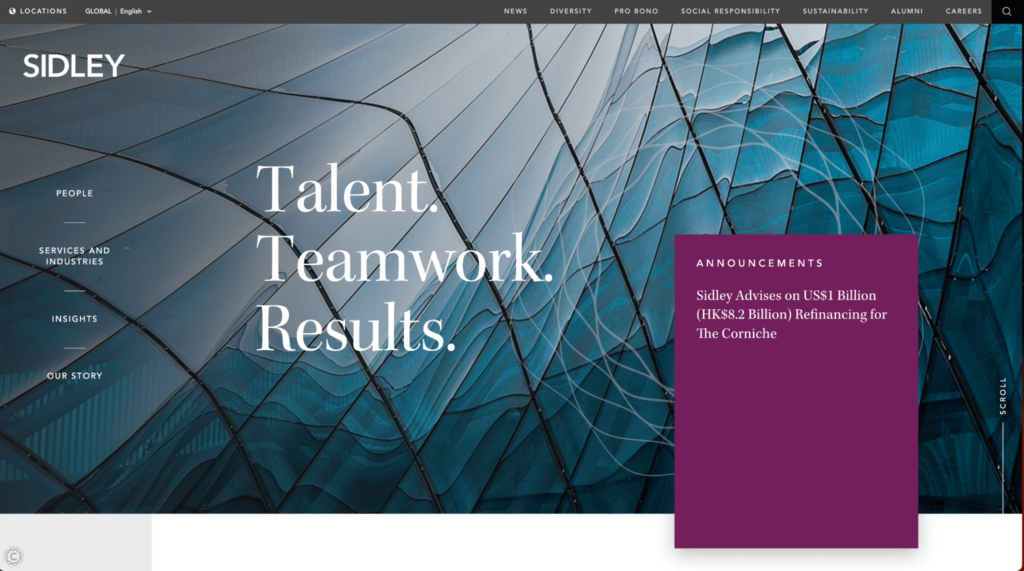 The abstract photograph used as the hero image and menu background is unusual but gives the site a modern feel. It also makes the header and menu text stand out without affecting readability. The announcement’s color block also does a great job of drawing attention to important information. - Cleary Gottlieb