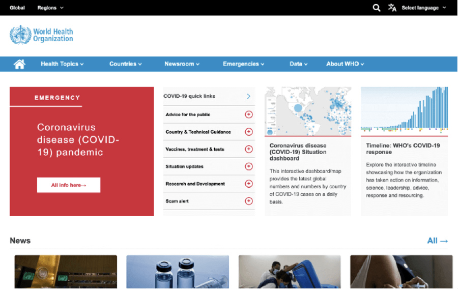 The WHO is a massive organization that serves an audience ranging from members of the public to government organizations all over the world. With so much content to display, this is an excellent example of a site that’s carefully organized and easy to navigate. Clean drop-down menus, a simple grid layout, and labeled content sections simplify finding the information you need.