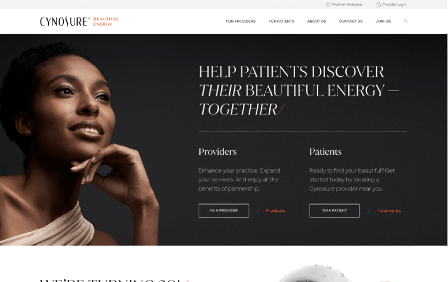 The tagline of aesthetic medical firm Cynosure is “Beautiful Energy.” The photographs on the site reflect this branding perfectly. Both the images and typography look and feel of a high-end fashion magazine.