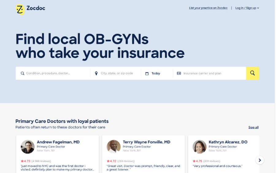 Blue is a popular branding color for healthcare businesses because it signifies trust and reliability. Zocdoc’s site features a pale blue background, which gives a calming feel to the site. The bright yellow of the logo is used to add visual interest to the site illustrations and make the CTAs stand out.