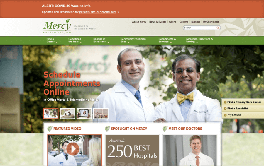 The structure of this site makes it easy to find what you’re looking for, whether you’re an existing patient or you’re visiting the site for the first time. Services and specialty centers are listed both in the menu and in a section on the homepage, and there’s a direct link to the patient portal.