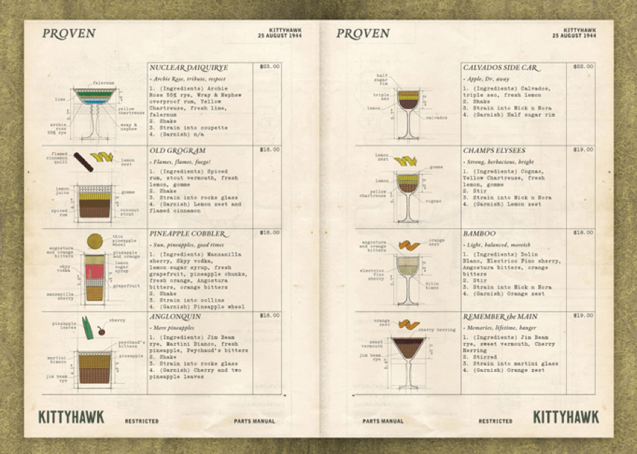 The Kittyhawk menu is pure genius. It’s a cocktail menu that uses diagrams to show how each drink is made. The design makes the drinks look tasty while also giving customers a lesson in mixology.