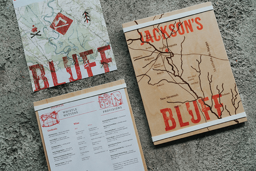 The unusual graphic style and materials give the Jackson’s Bluff menu a creative edge. The map illustration invites you to go on a journey when you visit this rooftop bar.