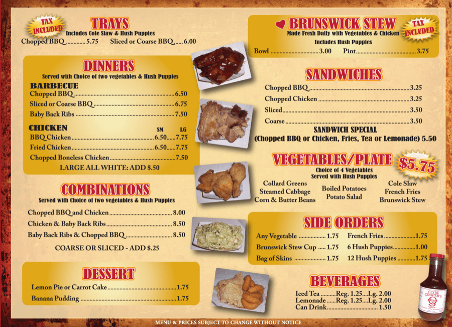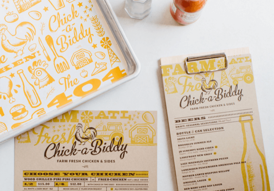 The Chick-a-Biddy menu is an example of a well-balanced design. There’s creative use of typography, illustrations, and color accents. While there’s a lot going on, the menu doesn’t feel busy. It’s easy to understand and very informative.