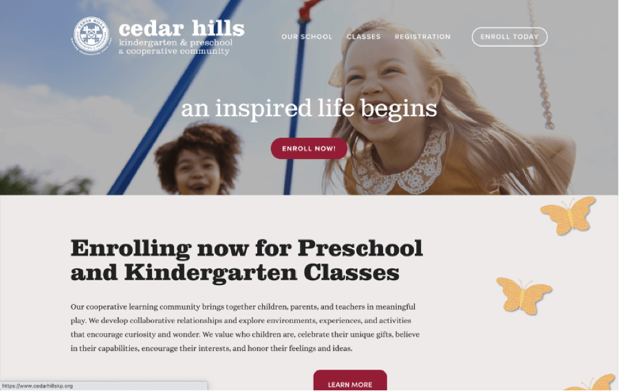 The site for Cedar Hills Preschool and Kindergarten is so simple in its structure but so effective. It relies heavily on written information, but this is presented in such a straightforward and beautiful way that it makes it very easy to read. Happy images feature alongside the text, which makes the site more visually memorable.