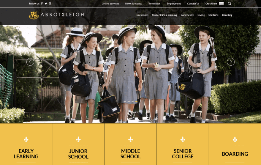 The simple structure of the Mentone Girls’ Grammar site instantly catches the eye. You can easily navigate to the campus you want, as these are separated into different sections on the site. The use of icons also makes it super-easy to contact the school or book a tour, which will appeal to parents looking for a smooth experience.