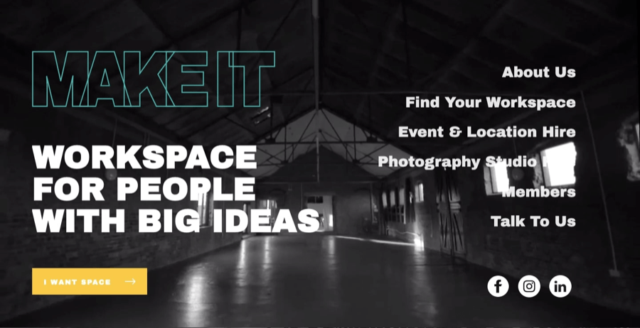 The Make It company offers access to unique workspaces across London. Their bold company is perfectly captured by their bold site — especially the typography. The size, color, and even shape of the font make it hard to ignore anything on this site.