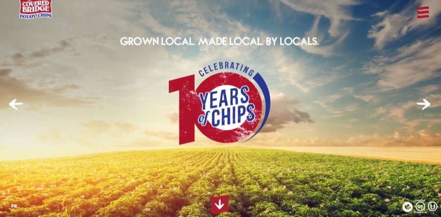 Covered Bridge Chips (creators of kettle-cooked potato chips) don’t mince words on their site. Why bother when an image is just as good? When you click through the full-screen hero image carousel you’ll see some great photos of the brand, the product, and a fun intro video.