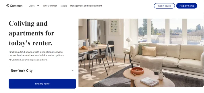 Common helps people conveniently find apartments and coliving spaces in major US cities. The startup features a quiz on its homepage to improve navigation. The dynamic quiz complements the eye-catching design to enhance user experience. The page uses clear images and compelling copy to showcase Common’s USP and offerings.