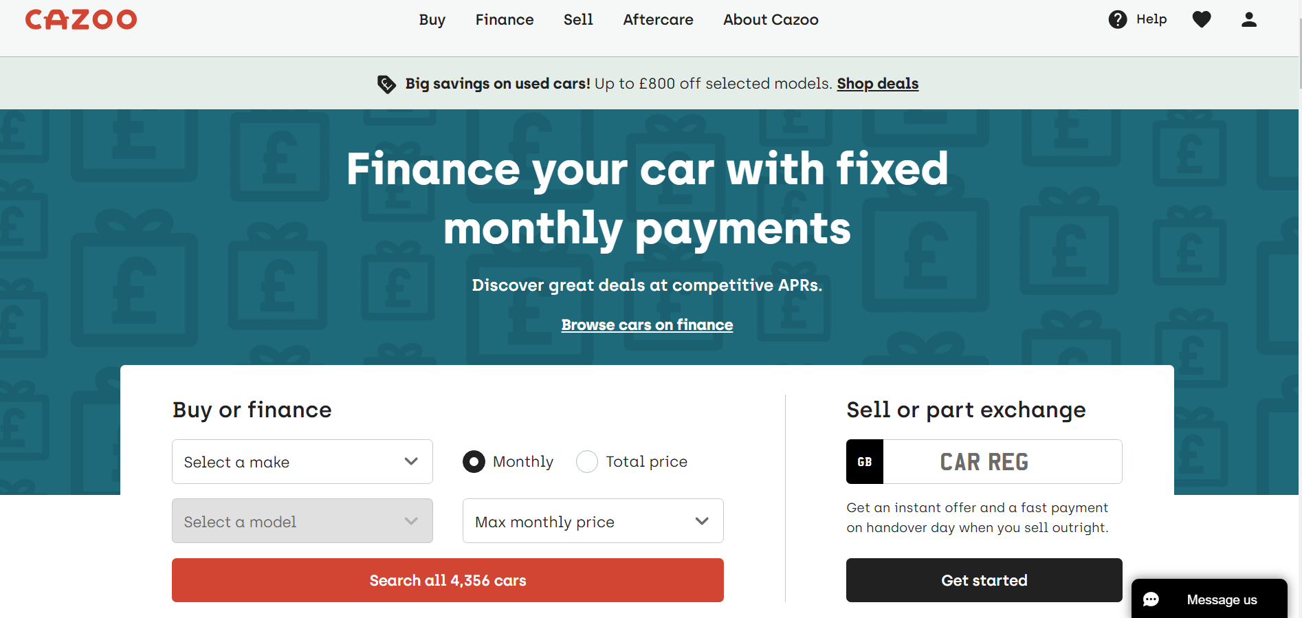 - Pros: Cazoo’s website shows a sound understanding of their customers’ needs. It uses various page elements to usher visitors into the correct sales funnel. The web page design makes for a frictionless process to recruit more users.