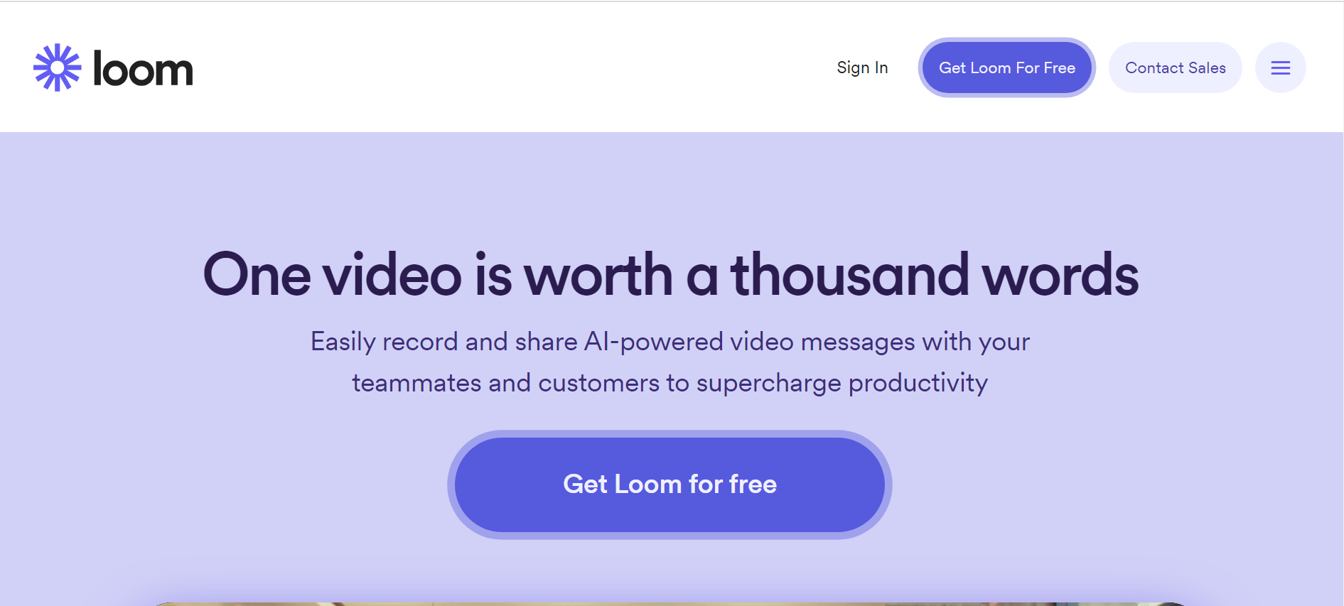 Loom allows you to record your computer screen. It uses a minimalist homepage to communicate its unique selling proposition. It uses a sticky headline to share the benefits and its USP. The homepage also features a video showing how Loom works and a clear CTA button.