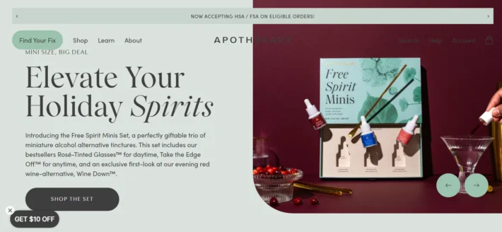 Apothékary promotes wellness through personalized natural solutions. The startup uses an interactive website to connect with its prospects. The brand demonstrates excellent customer insights. It includes a quiz and interactive content on the homepage to drive engagement. Motion graphics, targeted product offerings, and an appealing layout help drive sales.