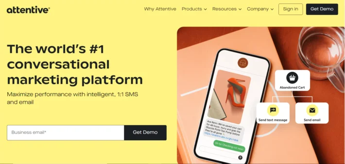 Attentive allows online businesses to target customers with personalized, automated text messages. The startup uses a colorful homepage with bold claims to showcase its value. A CTA button prompts visitors to book a demo.