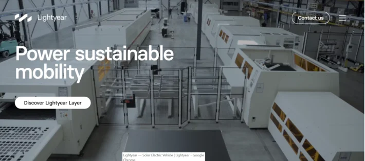 Lightyear produces innovative solar products to help customers switch to sustainable energy. The homepage features a video showcasing its state-of-the-art manufacturing facility. The rest of the page uses white space, clear copy, and images to craft a compelling story.