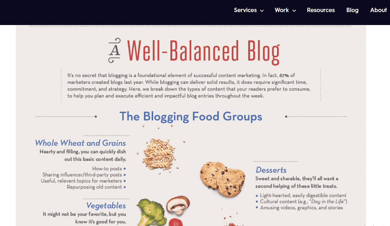 The Well-Balanced Blog infographic took the internet by storm — and for good reason. This engaging infographic has the right balance of wit, content, and visuals. It uses bite-sized data visualizations (all with a food theme, of course!) and short text elements to make one of the most enjoyable infographics we’ve ever seen.